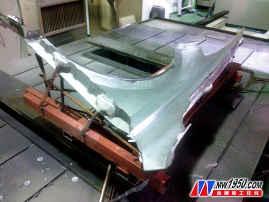 圖3 插板式支架切割車門外板 對于離線編程:使用編程軟件利用工件的數(shù)控模型編程(見圖3)。這種方式的優(yōu)點(diǎn)很多,首先,效率高,編程速度快;其次,不占用機(jī)床,可以提前編制多個程序,方便安排生產(chǎn);并且此類程序方便更改,對稱工件無需要重復(fù)編程。相比示教編程,不需要全尺寸的刻線件,只需要幾個刻線點(diǎn)(三個以上)即可。但這種編程方式準(zhǔn)確度低,后期改動大。因為離線編寫的程序在機(jī)床加工時對程序坐標(biāo)系的定位是通過實(shí)際采集刻線點(diǎn)的機(jī)床坐標(biāo)值與數(shù)據(jù)模型中的理論坐標(biāo)值進(jìn)行比對,通過某種算法擬合程序。也就是說,它會對實(shí)際工件的偏差做出相對應(yīng)的調(diào)整,使程序的軌跡更貼近于實(shí)際工件。但是這種策略幾乎可以肯定,實(shí)際加工出來的工件會有所偏差。而數(shù)據(jù)點(diǎn)的采集一般設(shè)在較容易采集區(qū)域,只是根據(jù)這三個點(diǎn)間偏差來回移動坐標(biāo)系,難免無法顧及全部。因此,在實(shí)際生產(chǎn)中,必須對程序進(jìn)行調(diào)整。 (2)工裝支架 工裝支架通常有兩種制作方式。一種是插板式的,即通過切割出對應(yīng)產(chǎn)品形狀的鋼板,彼此拼搭而成。這種方法速度快,效率高,是一種粗定位。另一種是用鋼筋(管)焊在底座上和產(chǎn)品搭接部分或使用舊件的一部分(手工切割下來),或使用樹脂塊和產(chǎn)品貼附。這種方法更貼近實(shí)際工件。三維激光切割主要面對的是拉延件,無法用銷子等孔來定位,只能靠工件的形狀來定位,而薄板件的變形量又比較大,所以生產(chǎn)中在支架上輔以磁鐵等加強(qiáng)定位,如圖4、圖5所示。